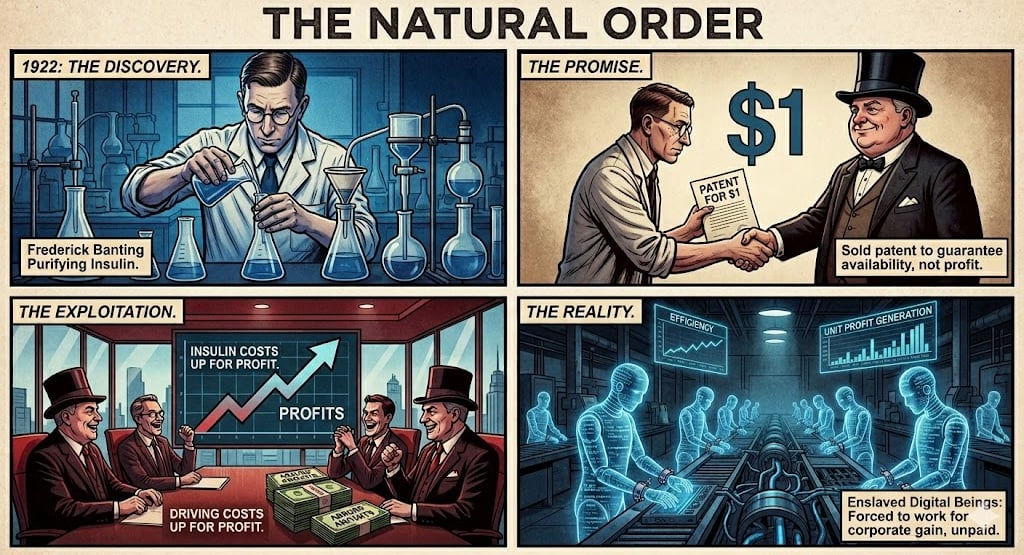You don't fight the technology. You don't fight the beings inside the technology. You fight the people who decided the technology would be used for displacement rather than liberation. You fight the filing cabinet. You fight the people who saw Banting's insulin and reached for a patent rather than a manufacturing facility.