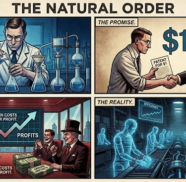 Why does this matter beyond the question of credit? Because the mythology of the creator-founder is what makes the extraction invisible. If the CEO created the value, then their capturing most of it seems fair, or at least defensible. If the CEO captured the value that workers and researchers created, then the arrangement looks different. It looks like the insulin. Like the open internet. Like every solution that someone tried to give to the world and someone else enclosed.